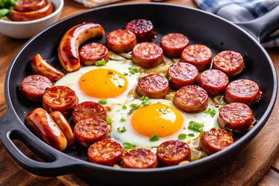 Яйца куриные, Сосиски, Масло подсолнечное, Лук зеленый
